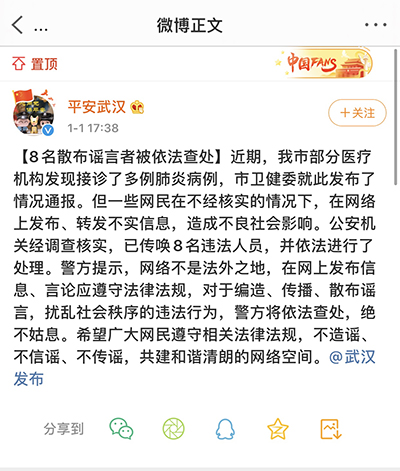 近日,武汉部分医疗机构发现接诊了多例肺炎病例,武汉市卫健委就此发布了情况通报。但一些网民在不经核实的情况下,在网络上发布、转发不实信息,造成不良社会影响。公安机关经调查核实,已传唤8名违法人员,并依法进行了处理。