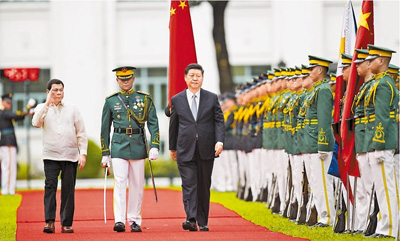 菲律宾总统府充满庄严、隆重、热烈的气氛。当地时间下午4时40分许,习近平乘车抵达总统府,受到杜特尔特热情迎接。两国元首登上检阅台。仪仗队行持枪礼。鼓手敲起激昂的鼓点,号手吹响迎宾的号声。军乐队奏中菲两国国歌。现场鸣放21响礼炮。习近平在杜特尔特陪同下沿红地毯检阅仪仗队。检阅毕,习近平同菲方主要官员握手,杜特尔特同中方陪同人员握手。两国元首共同前往总统府主楼。沿途,当地艺术家伴着菲律宾传统竹管弦乐翩翩起舞,悠扬的乐声、曼妙的舞姿吸引两国元首不时驻足欣赏。